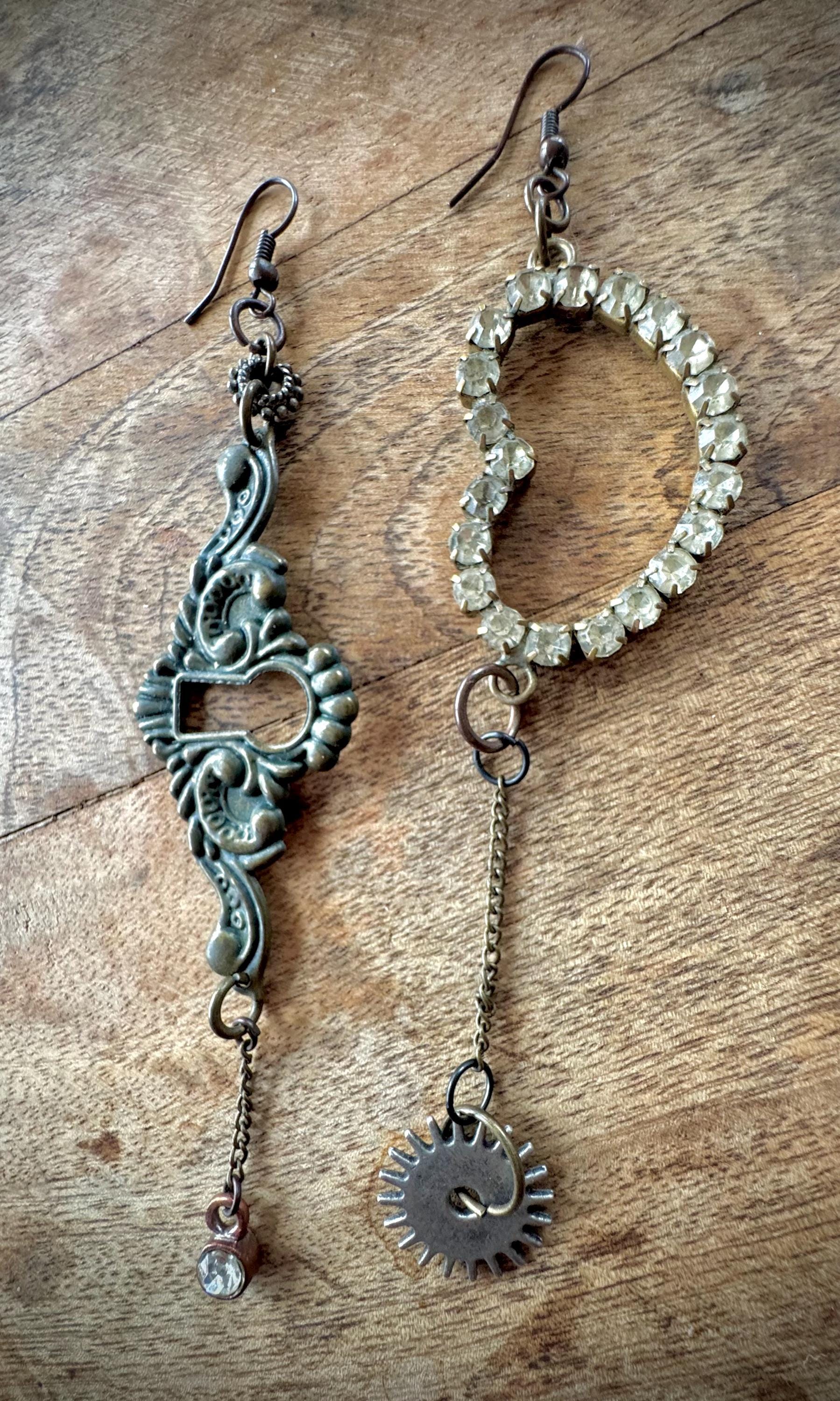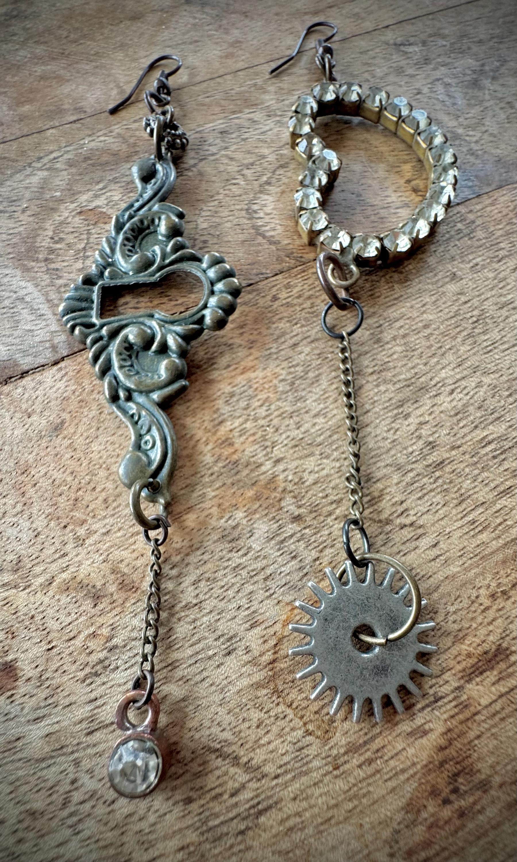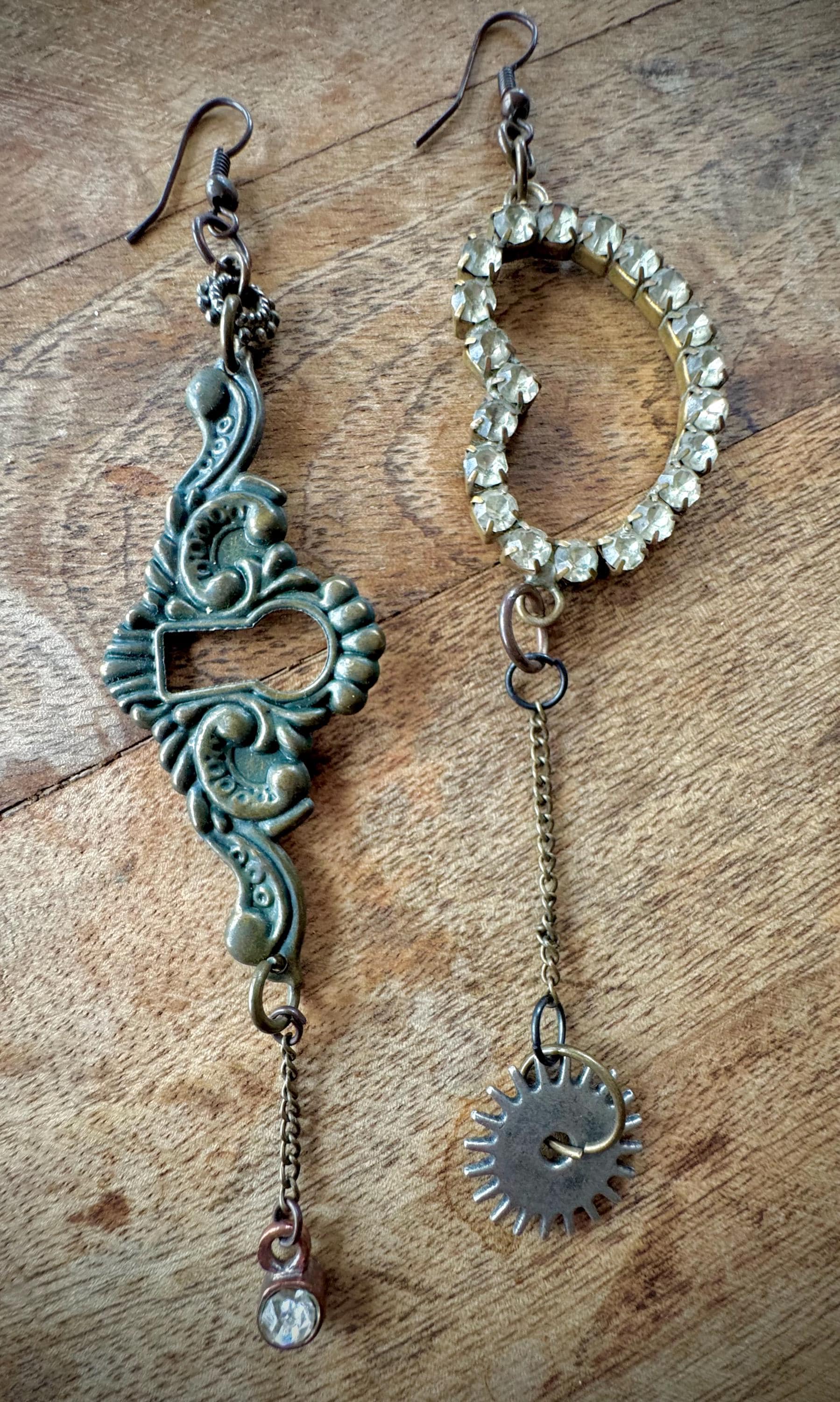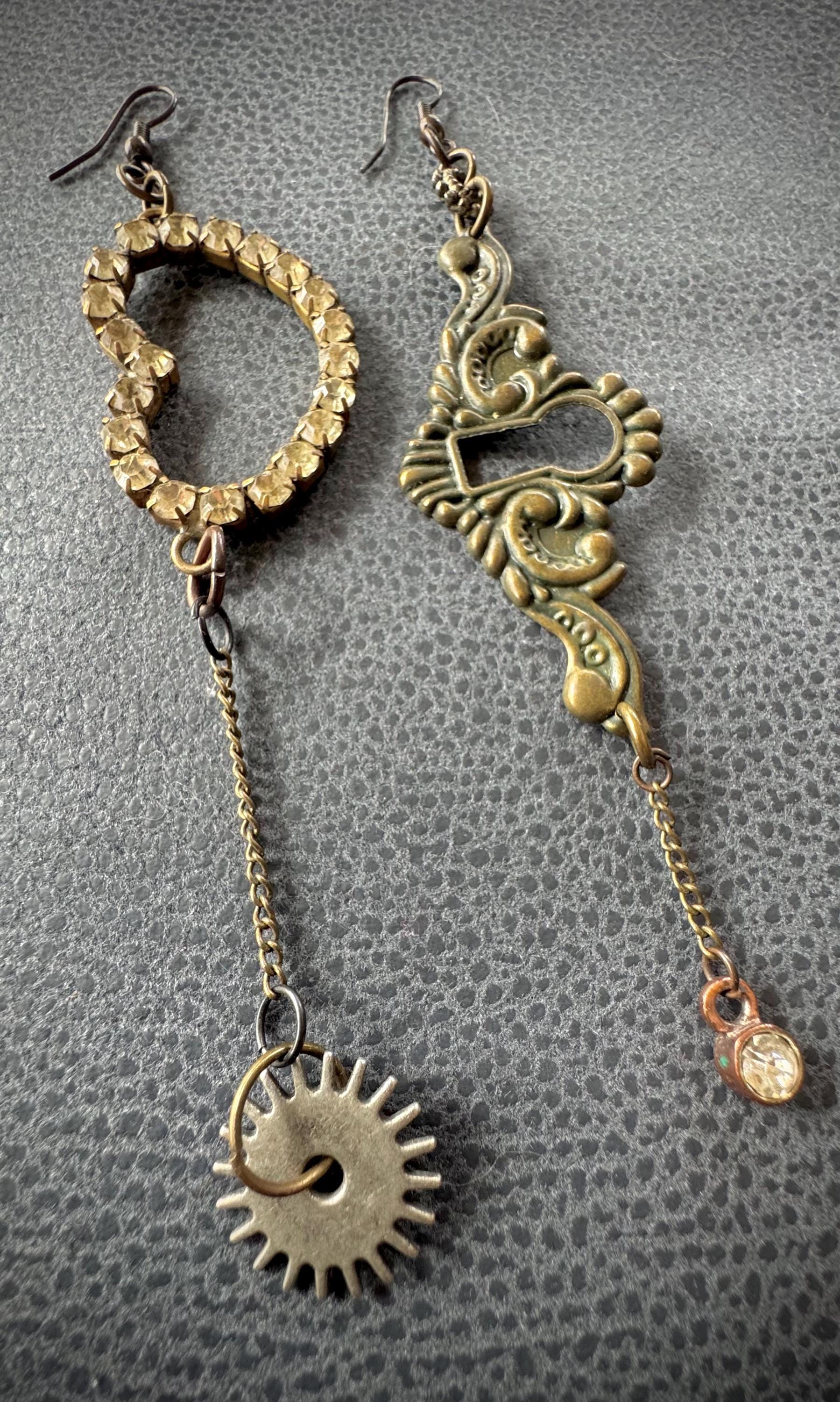 Upcycled Asymmetrical Mismatched Earrings created with mixed metals and findings including rhinestone heart finding. These are bold and fun to wear to make a statement.Earrings are about 5" long.