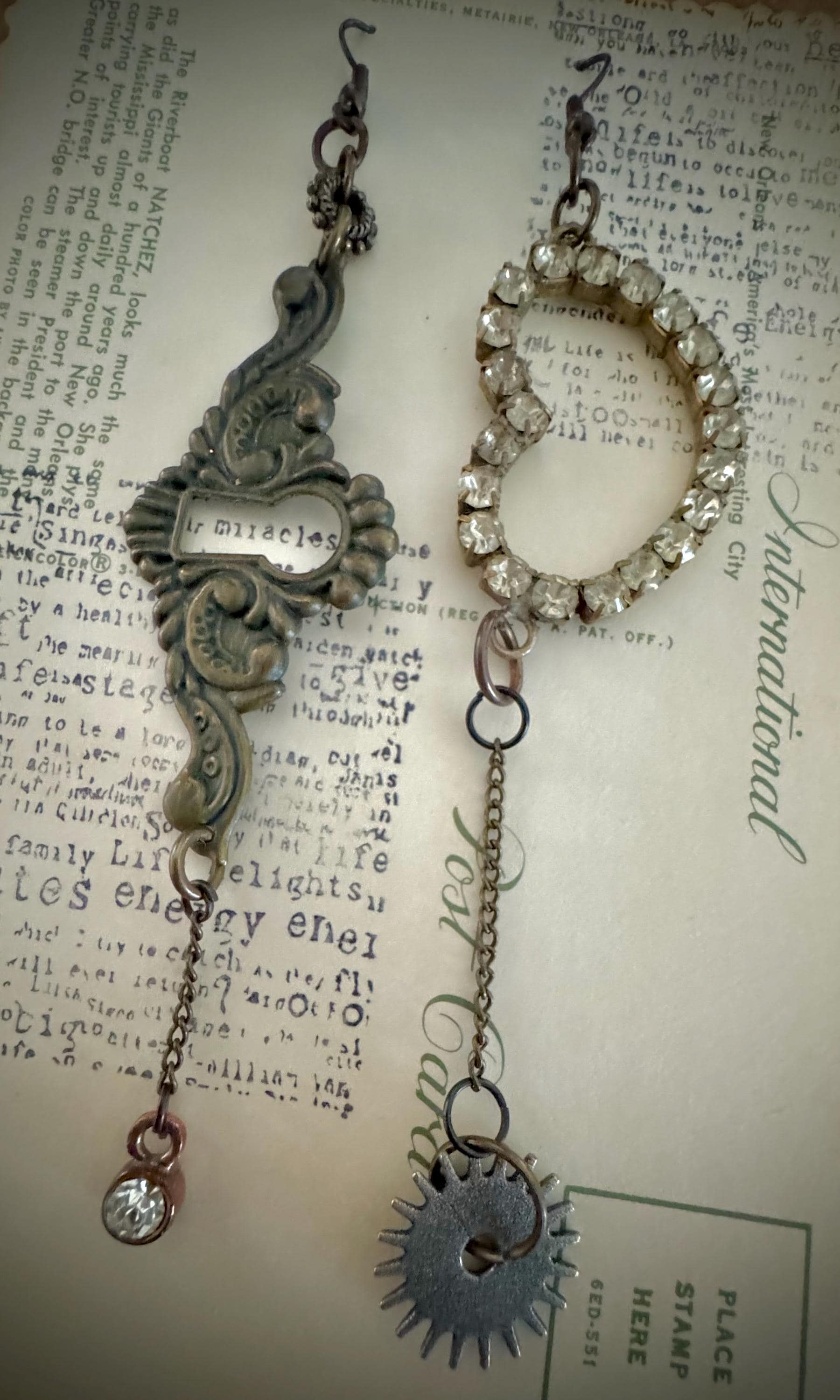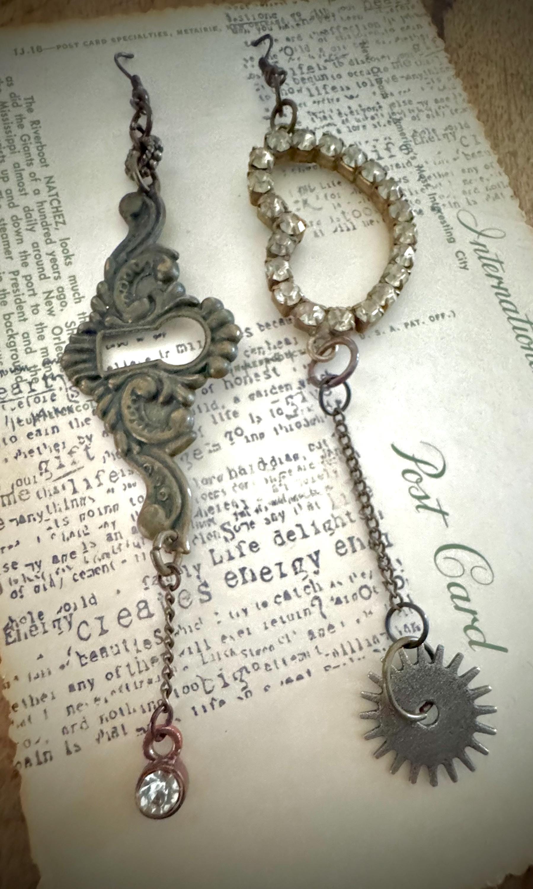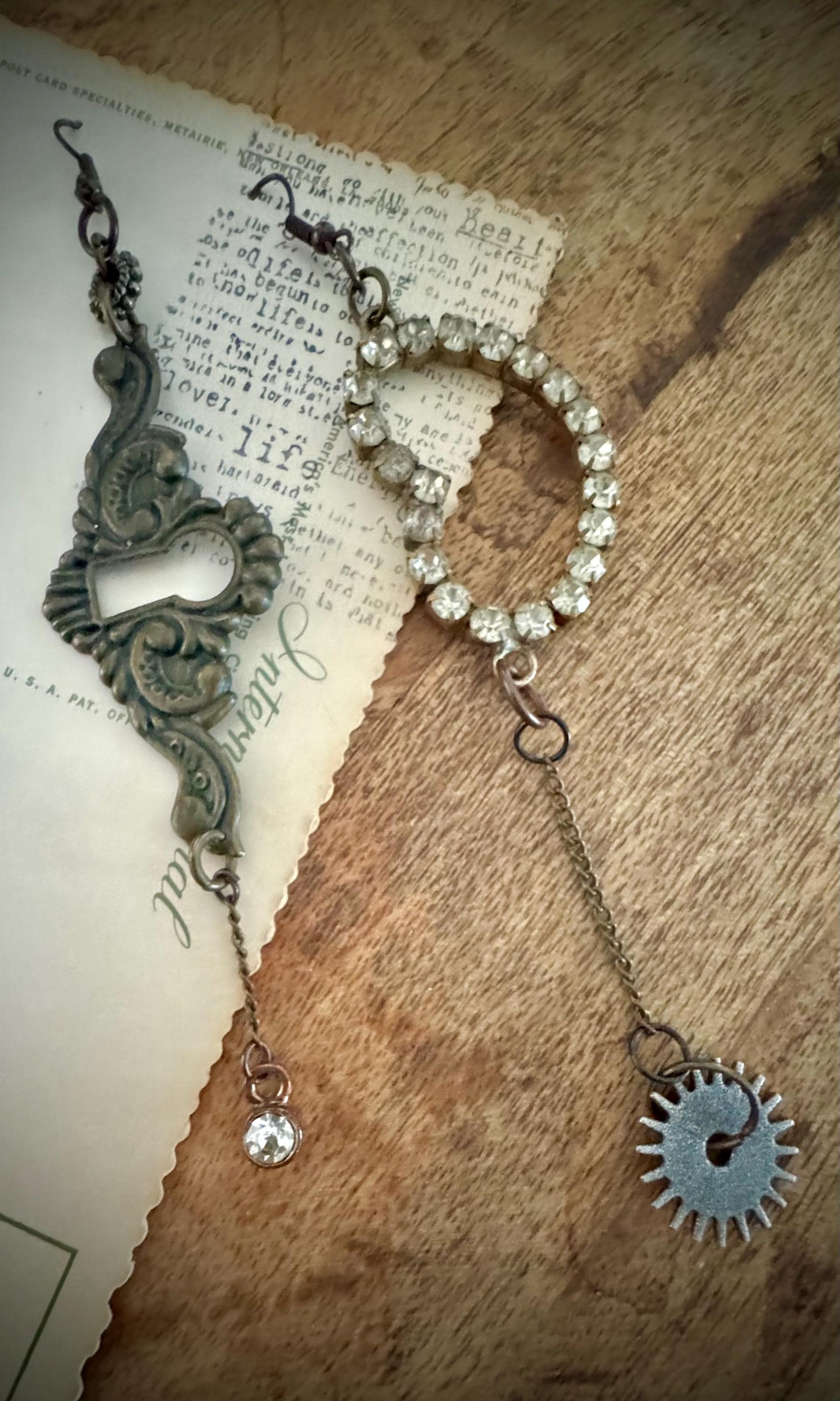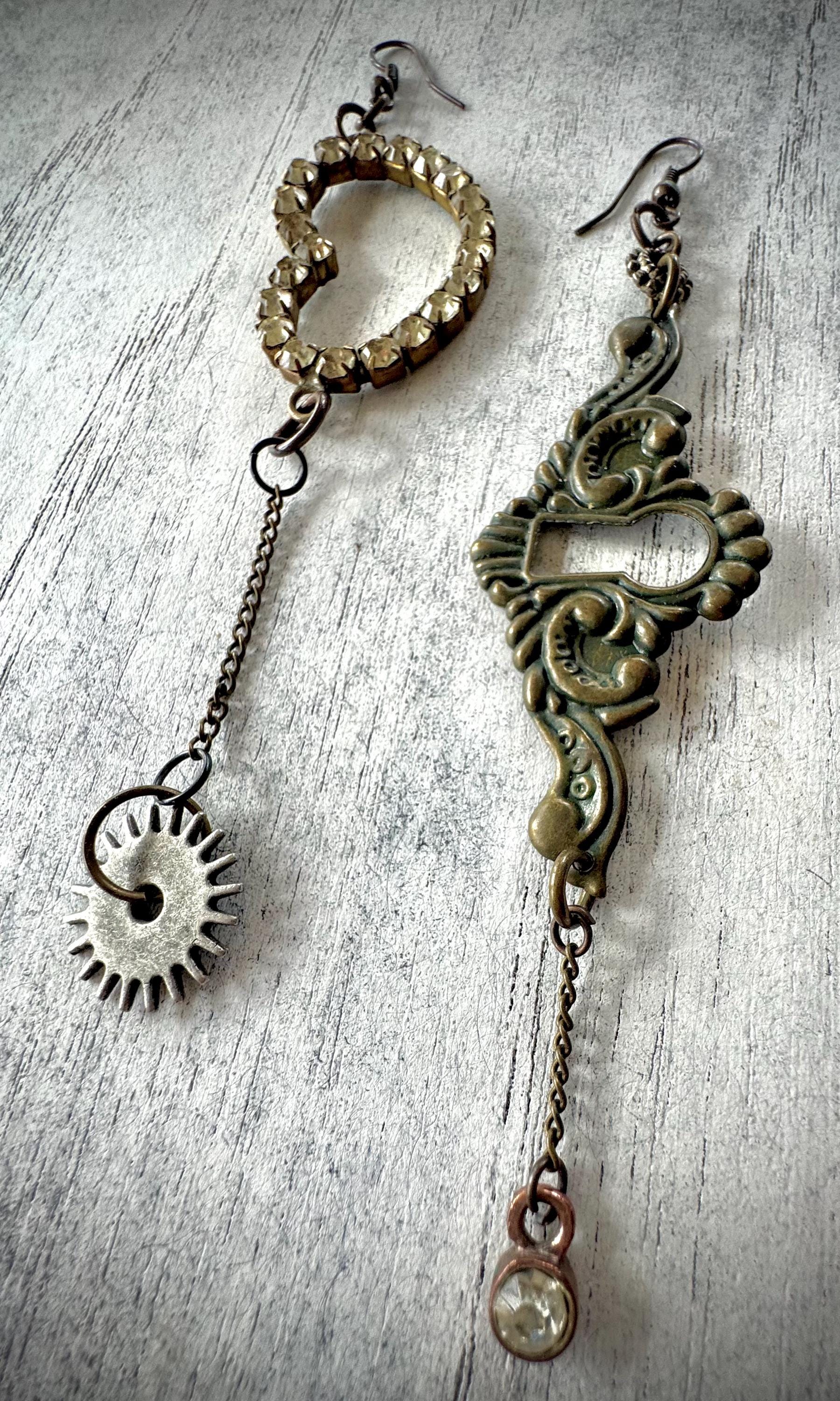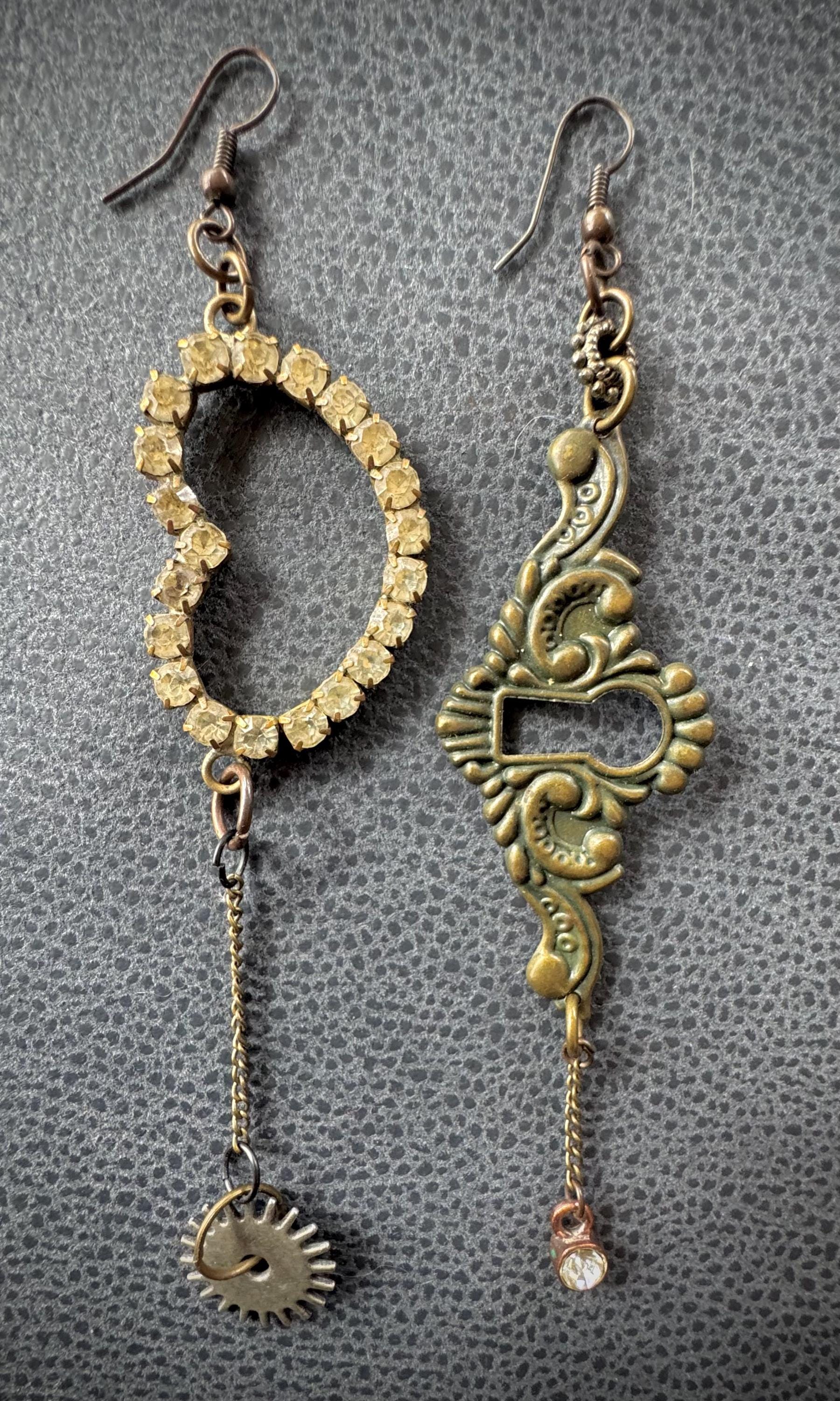 Upcycled Asymmetrical Mismatched Earrings created with mixed metals and findings including rhinestone heart finding. These are bold and fun to wear to make a statement.Earrings are about 5" long.