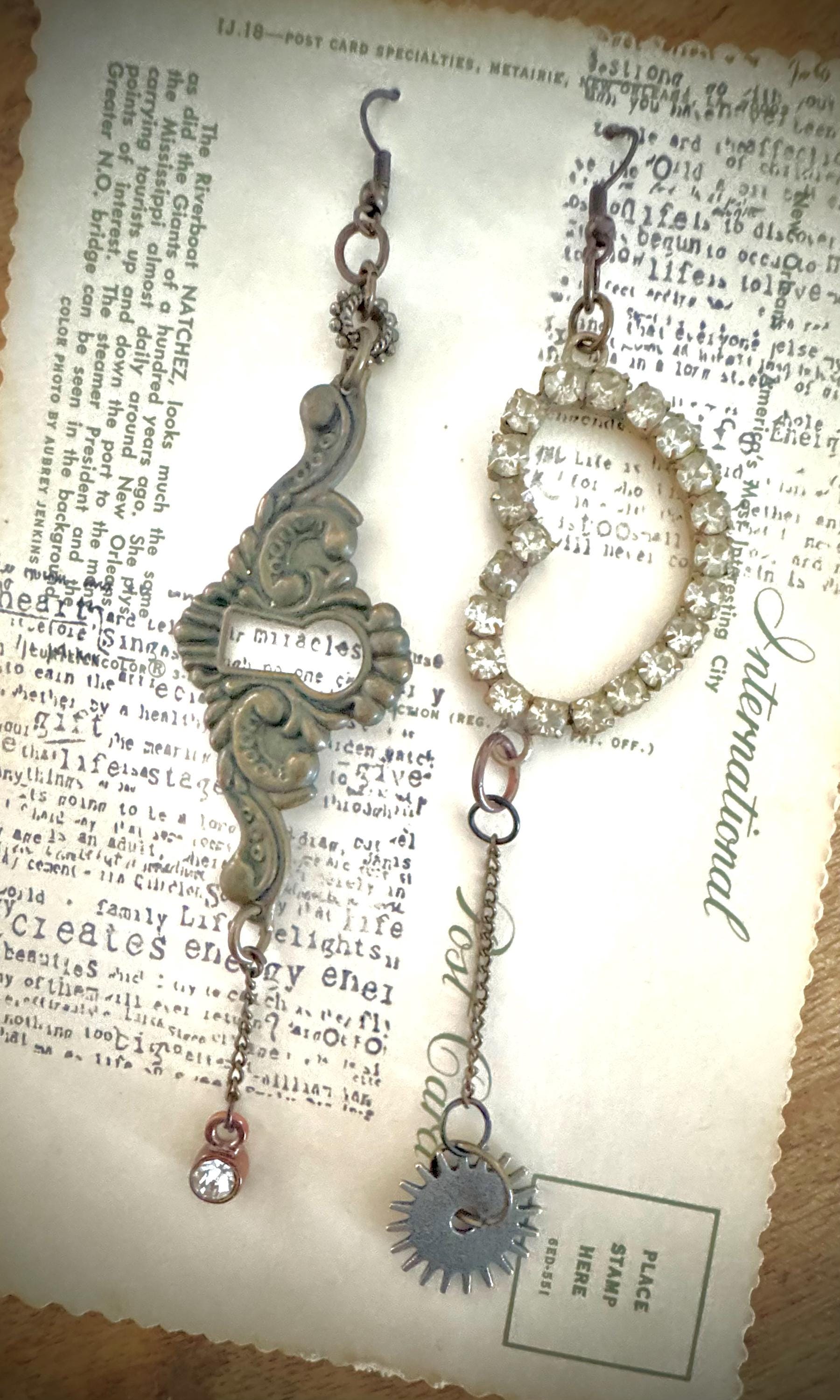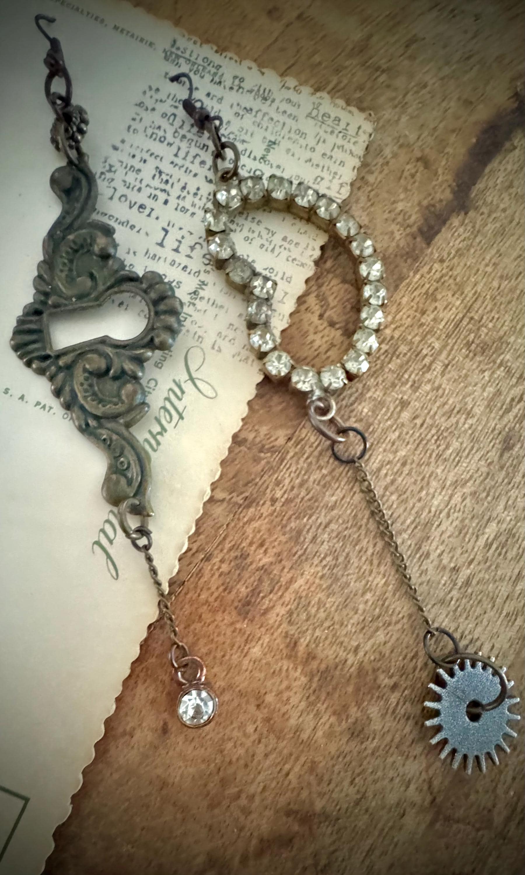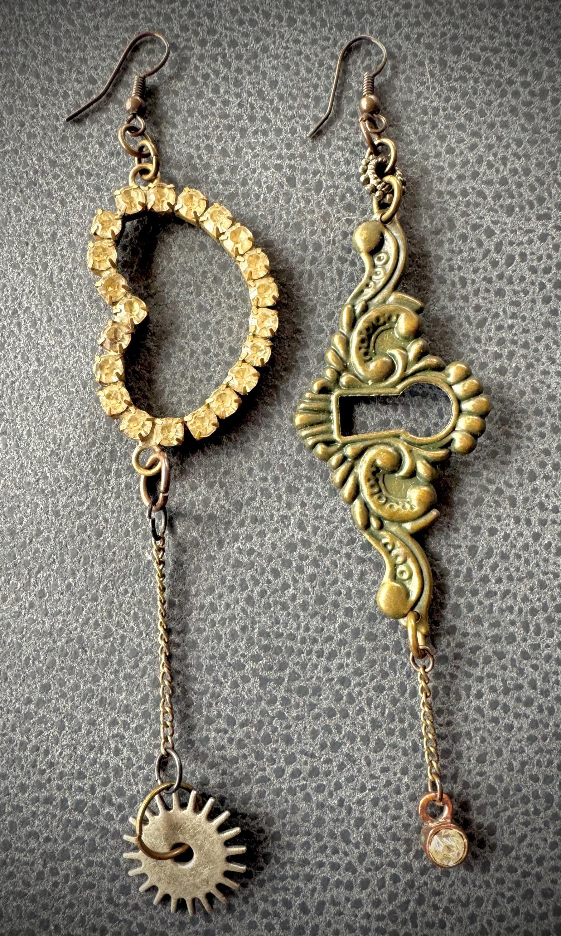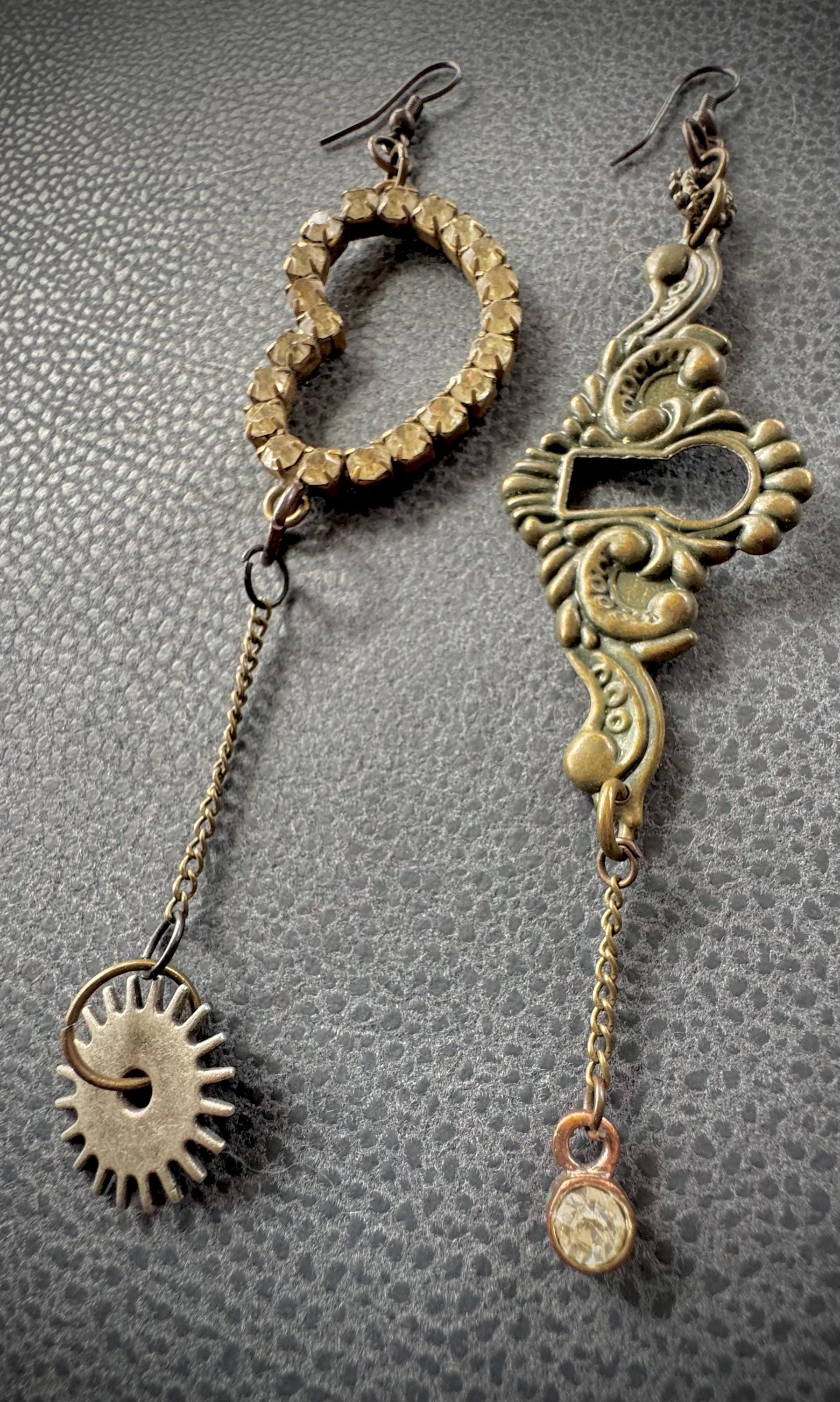 Upcycled Asymmetrical Mismatched Earrings created with mixed metals and findings including rhinestone heart finding. These are bold and fun to wear to make a statement.Earrings are about 5" long.