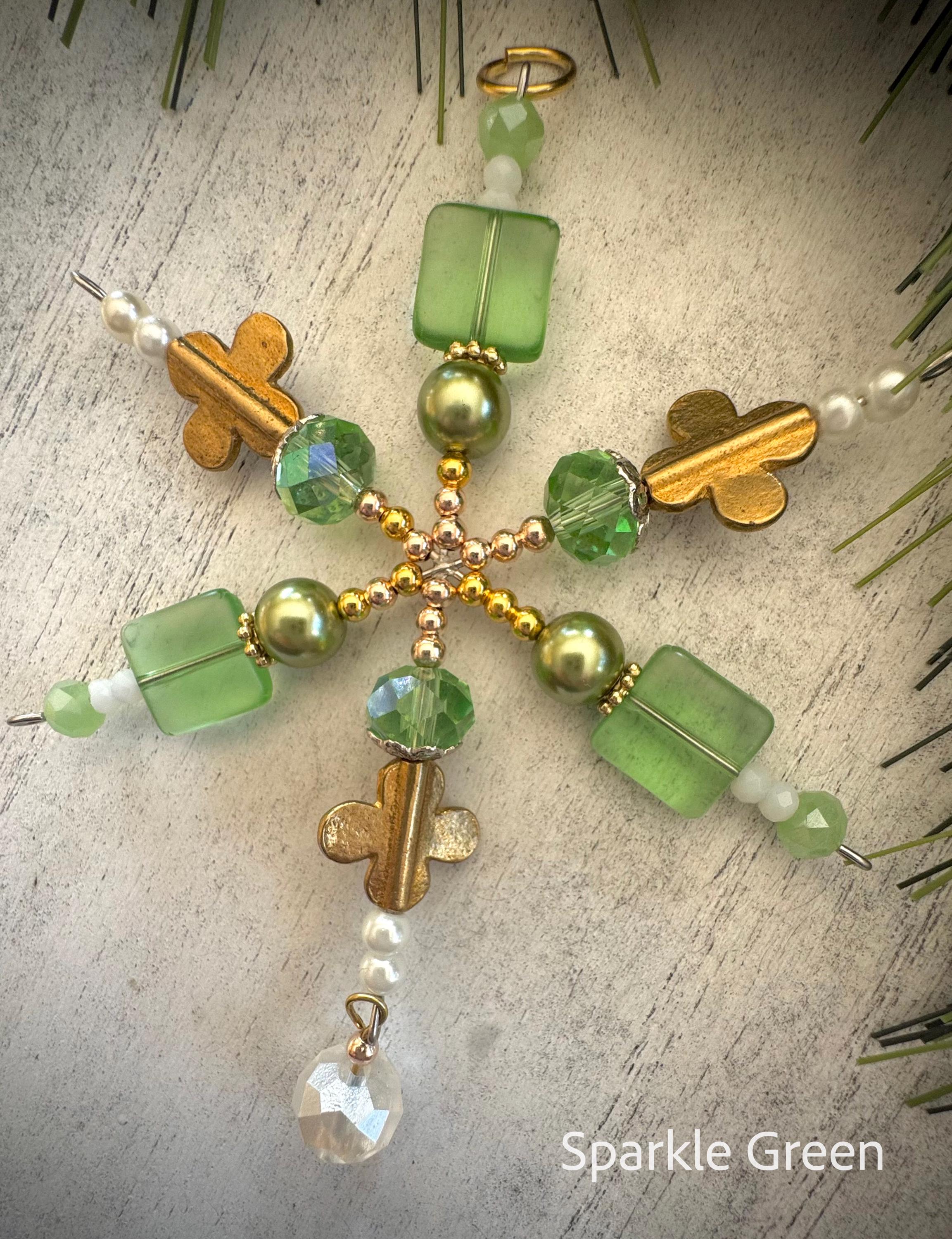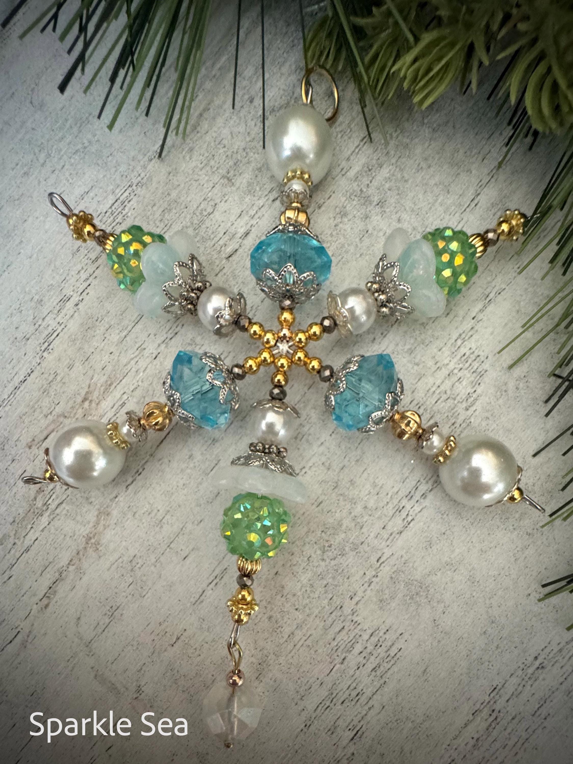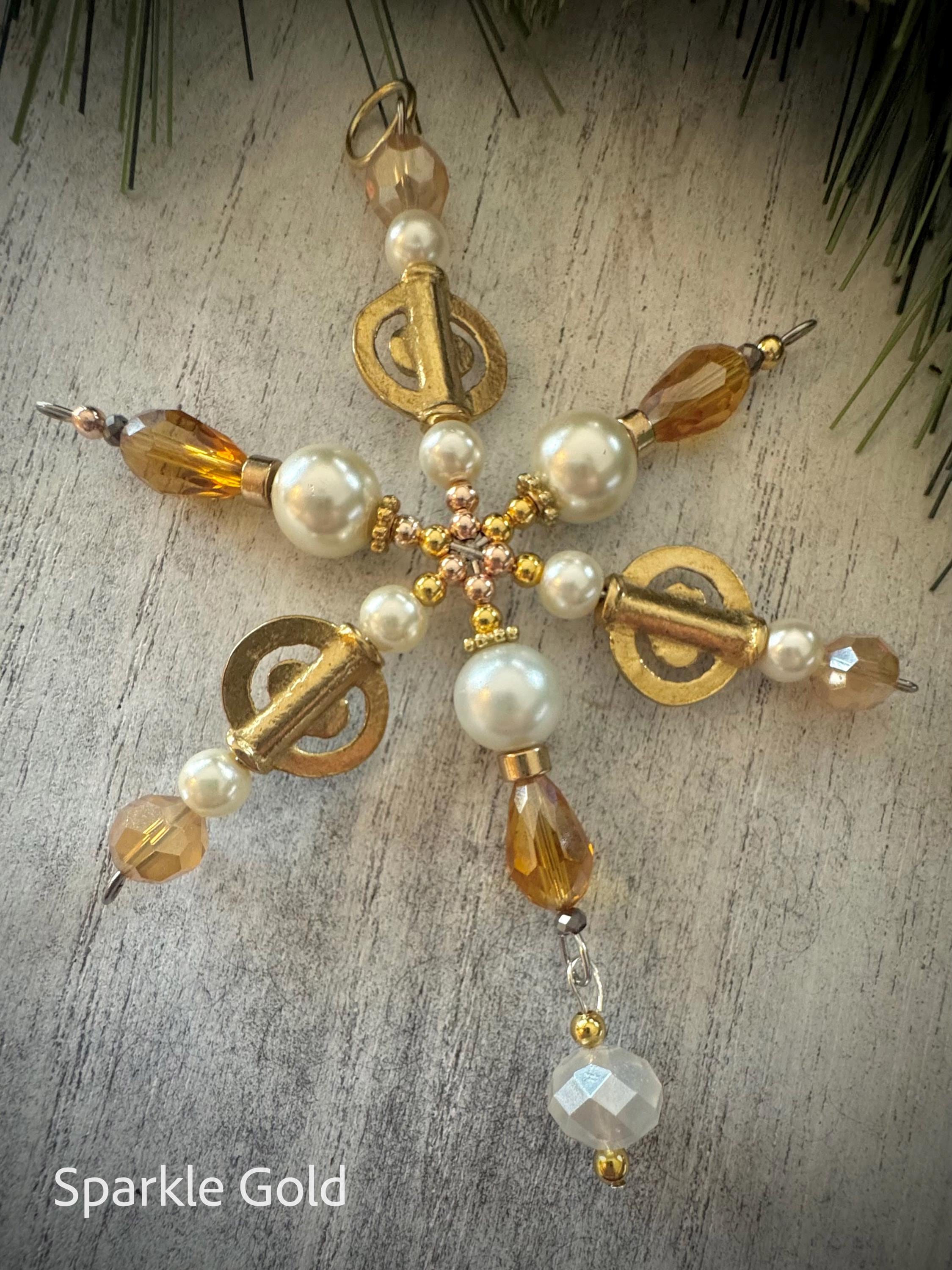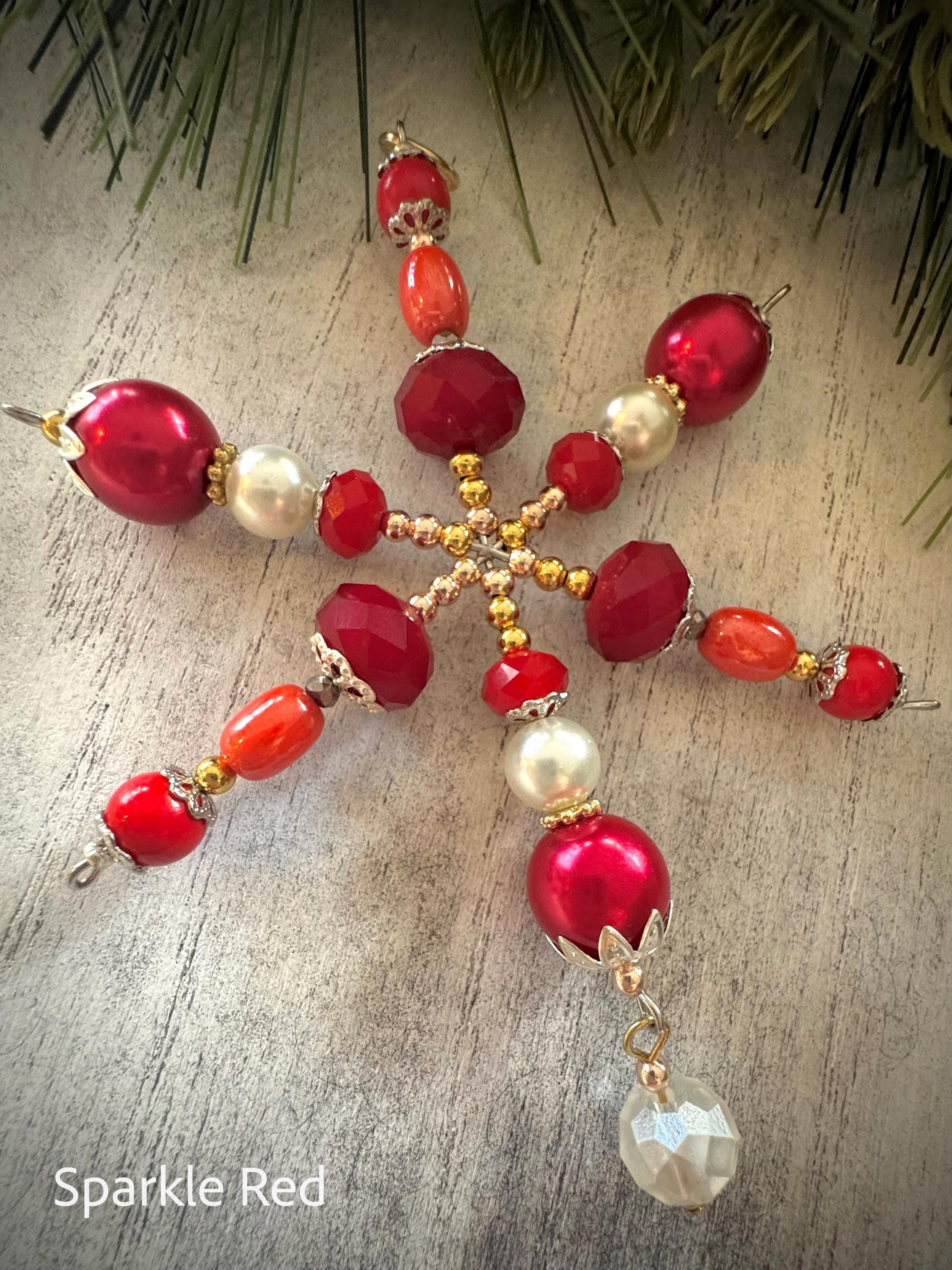 Snowflake Series—Ornaments…Jewelry…Gift attachment. “Dress a tree…wear on a chain…embellish a gift!” These are beautiful beaded ornaments, great for the tree, but can also be worn as a necklace (fun for a party), or added as a decorative embellishment on a gift.