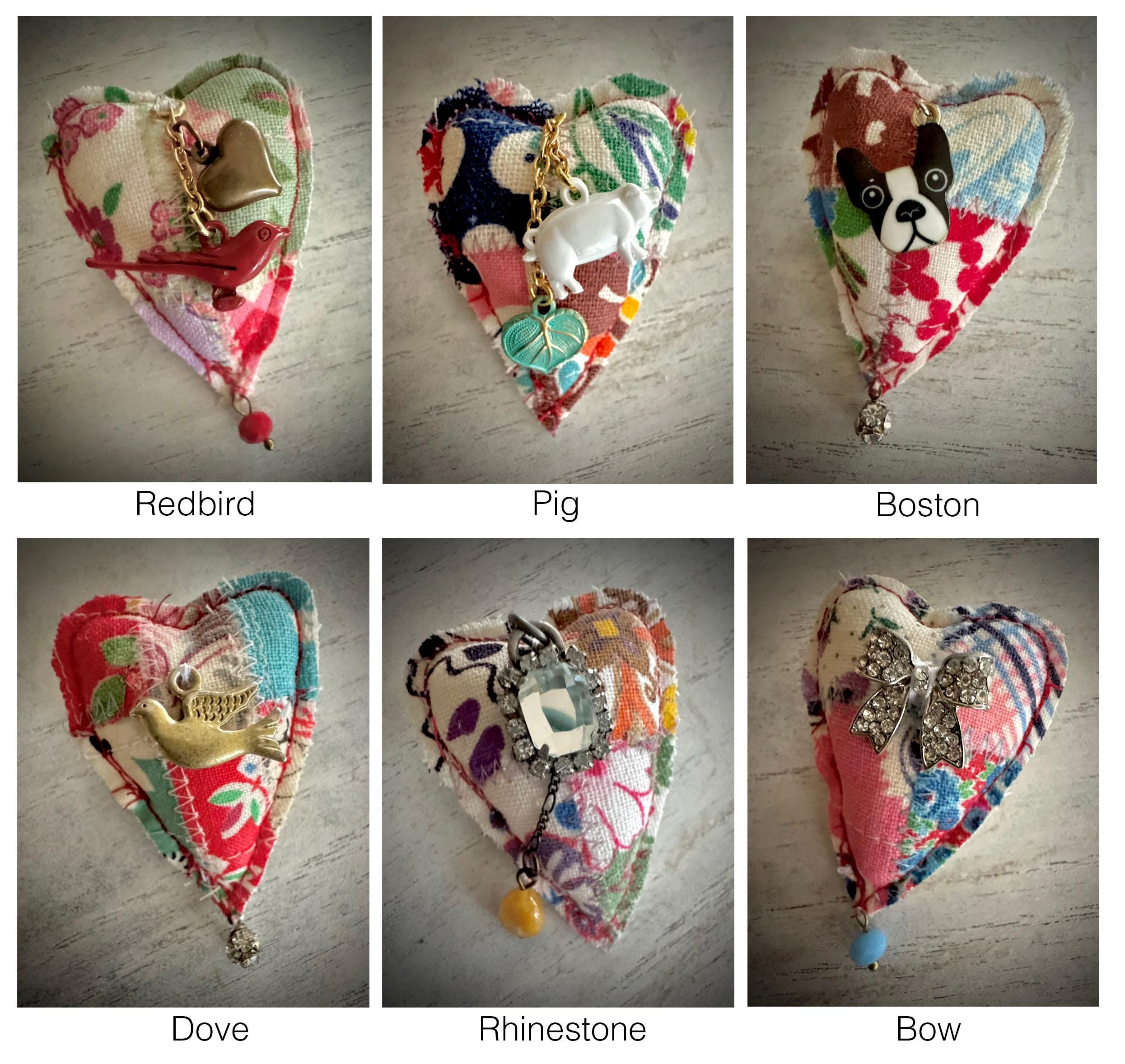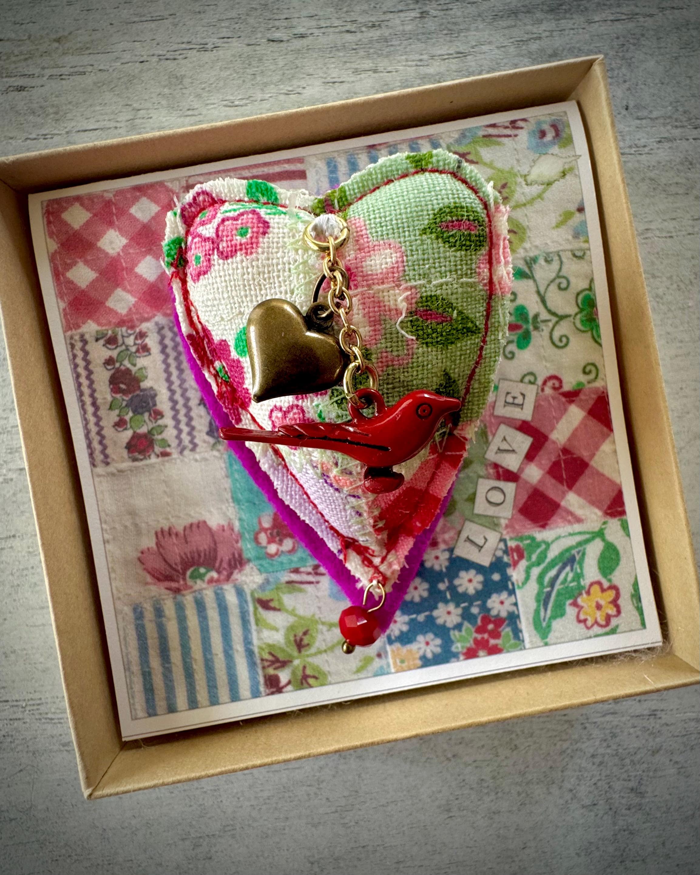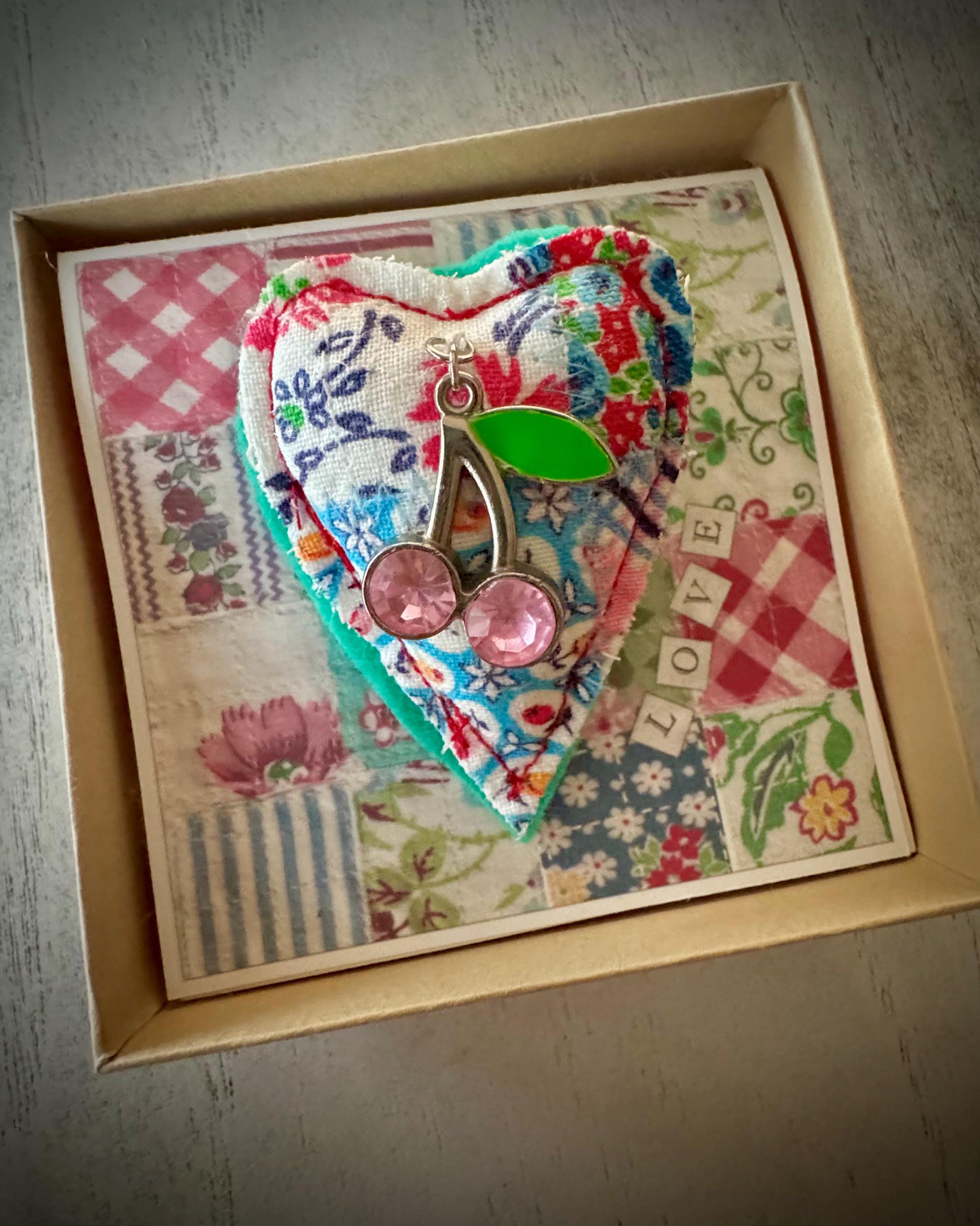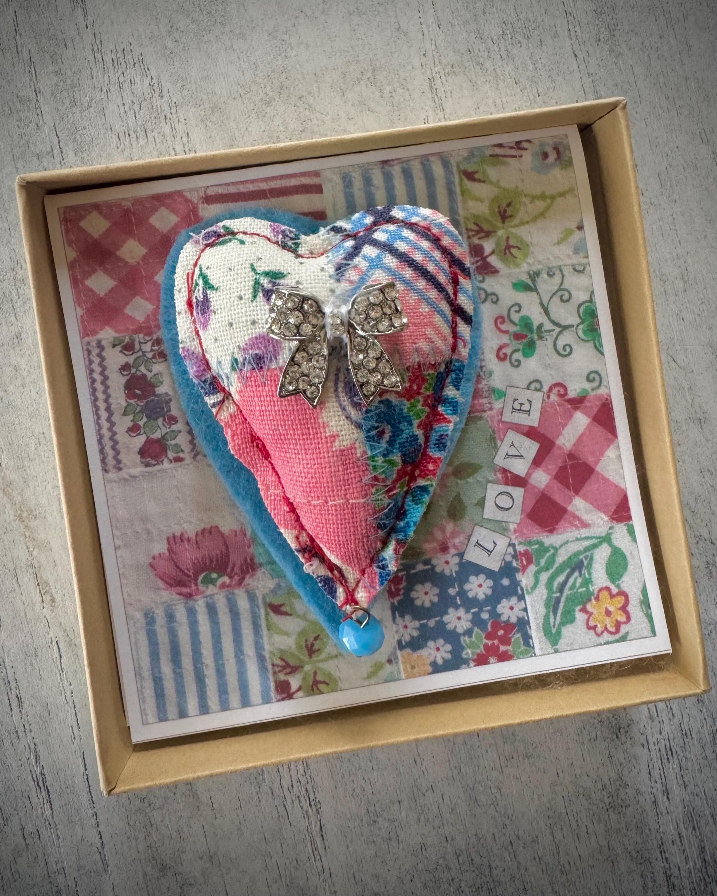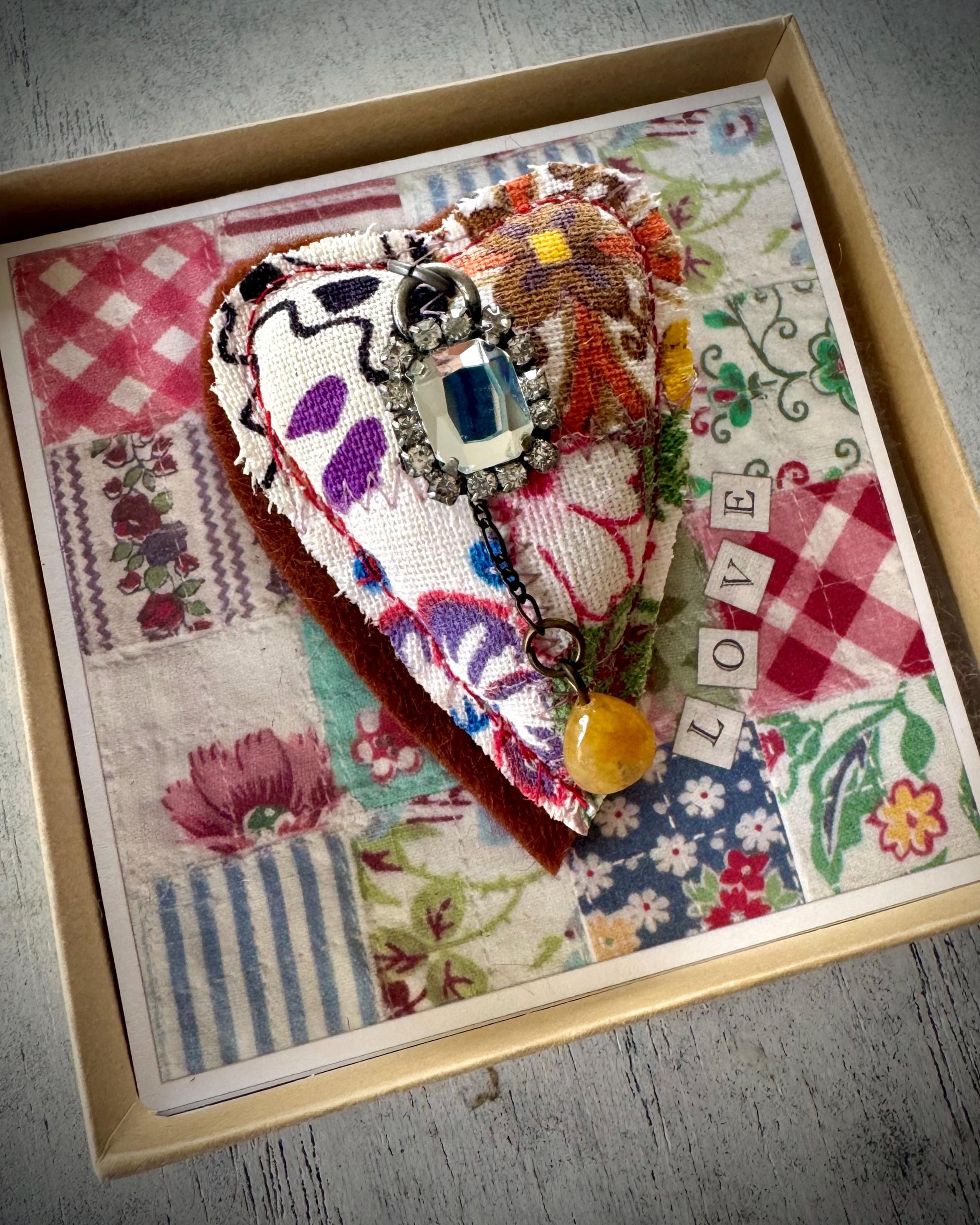 Embellished Upcycled Plush Heart Brooch with Greeting Card and Gift Box...All in one! Sweet fun gift for giving. Pick your greeting card sentiment. Heart brooch is attached to front of greeting card. Remove it to wear on a denim jacket or something fun.
