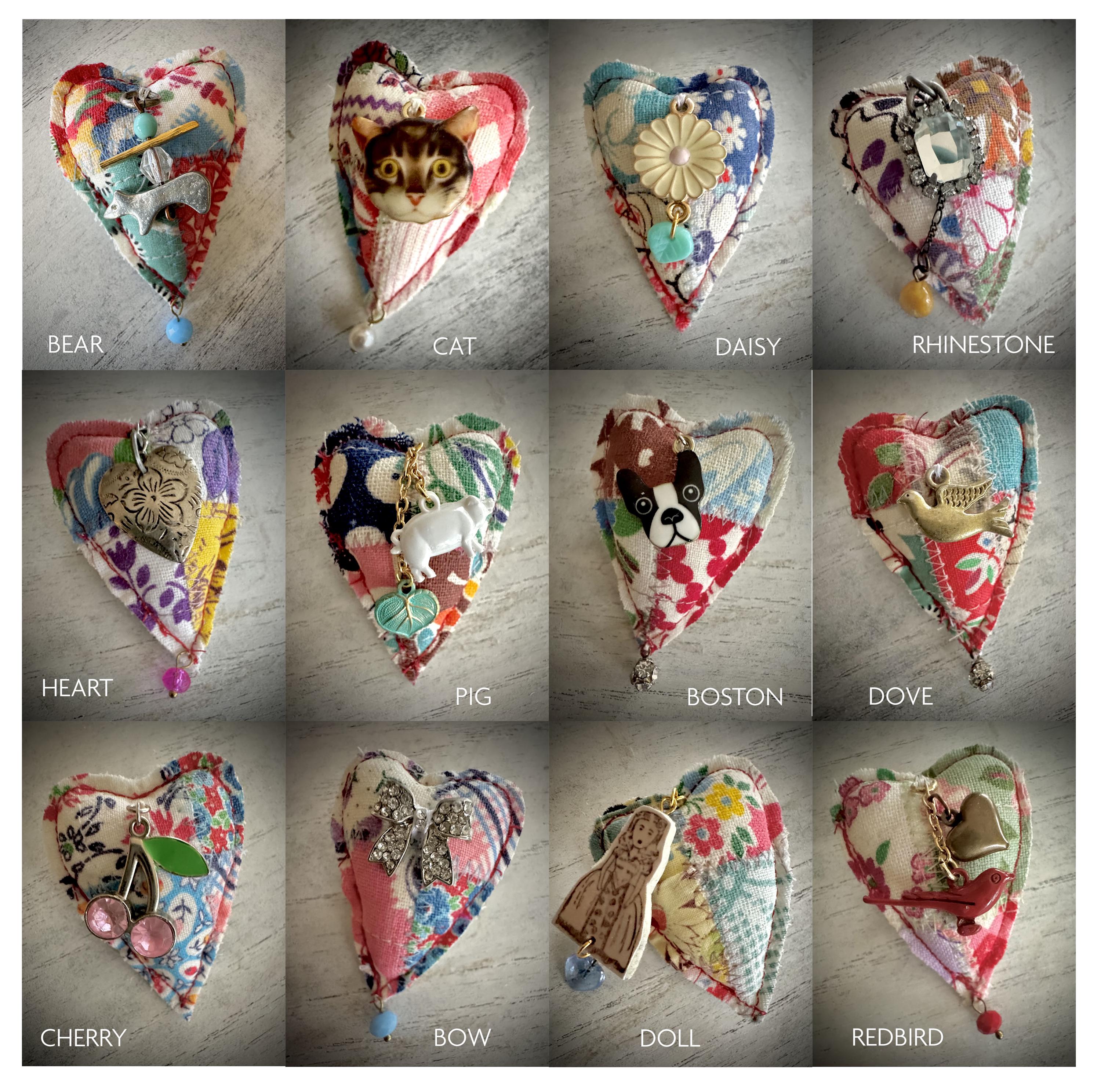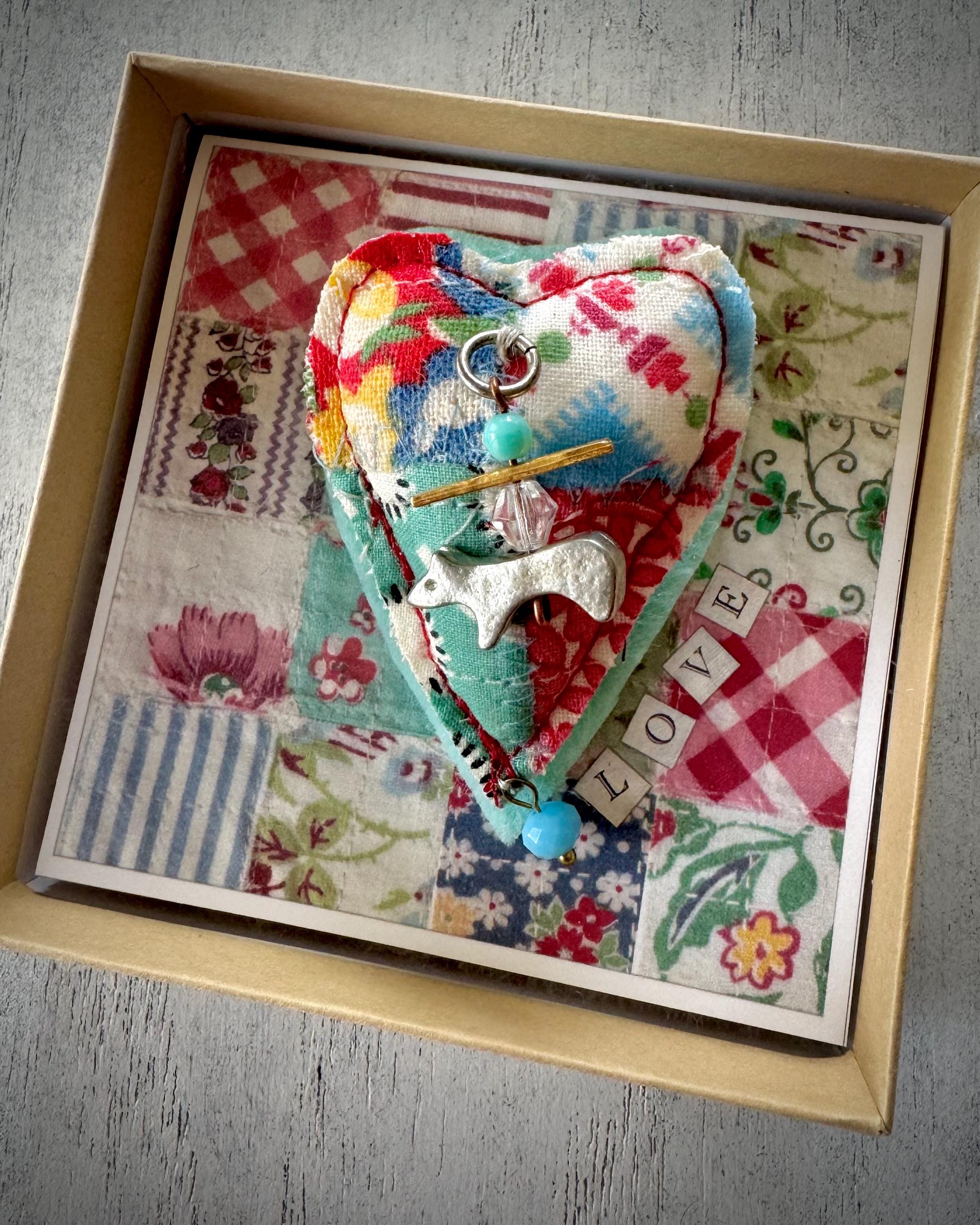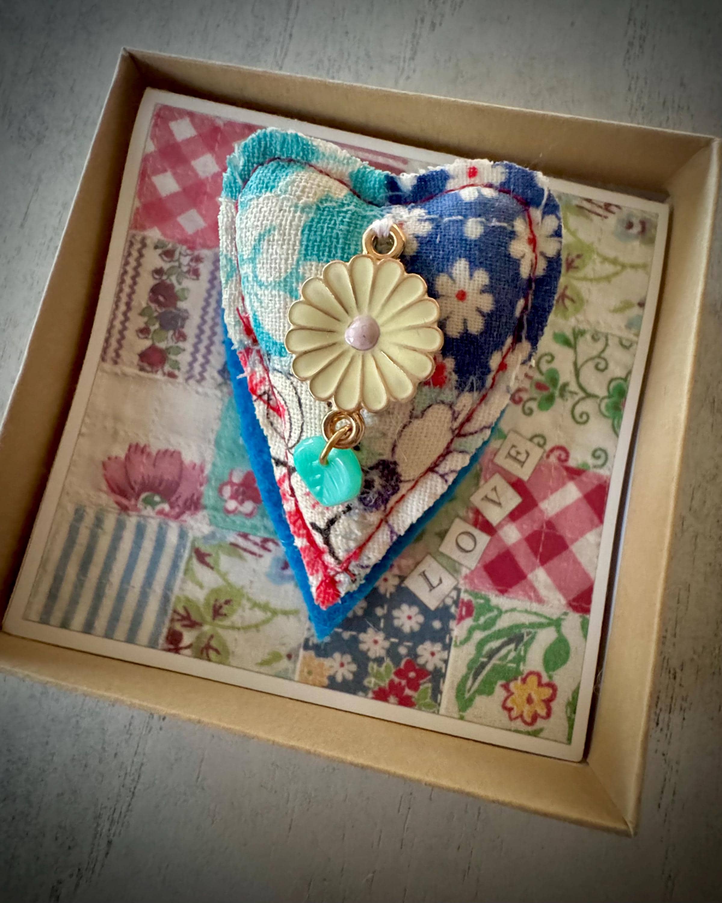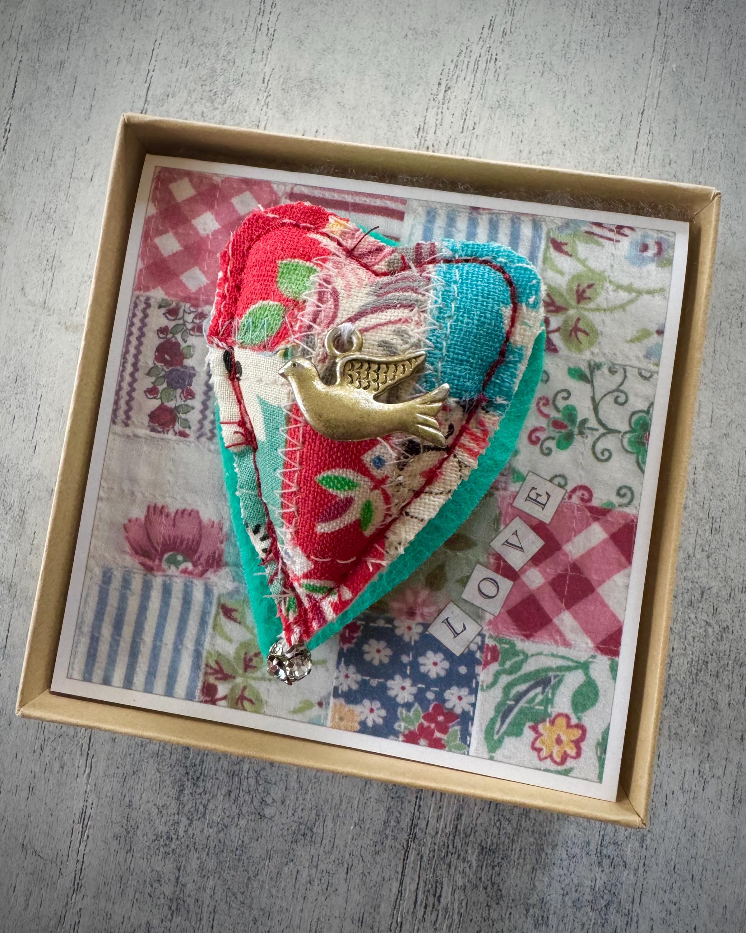 Embellished Upcycled Plush Heart Brooch with Greeting Card and Gift Box...All in one! Sweet fun gift for giving. Pick your greeting card sentiment. Heart brooch is attached to front of greeting card. Remove it to wear on a denim jacket or something fun.