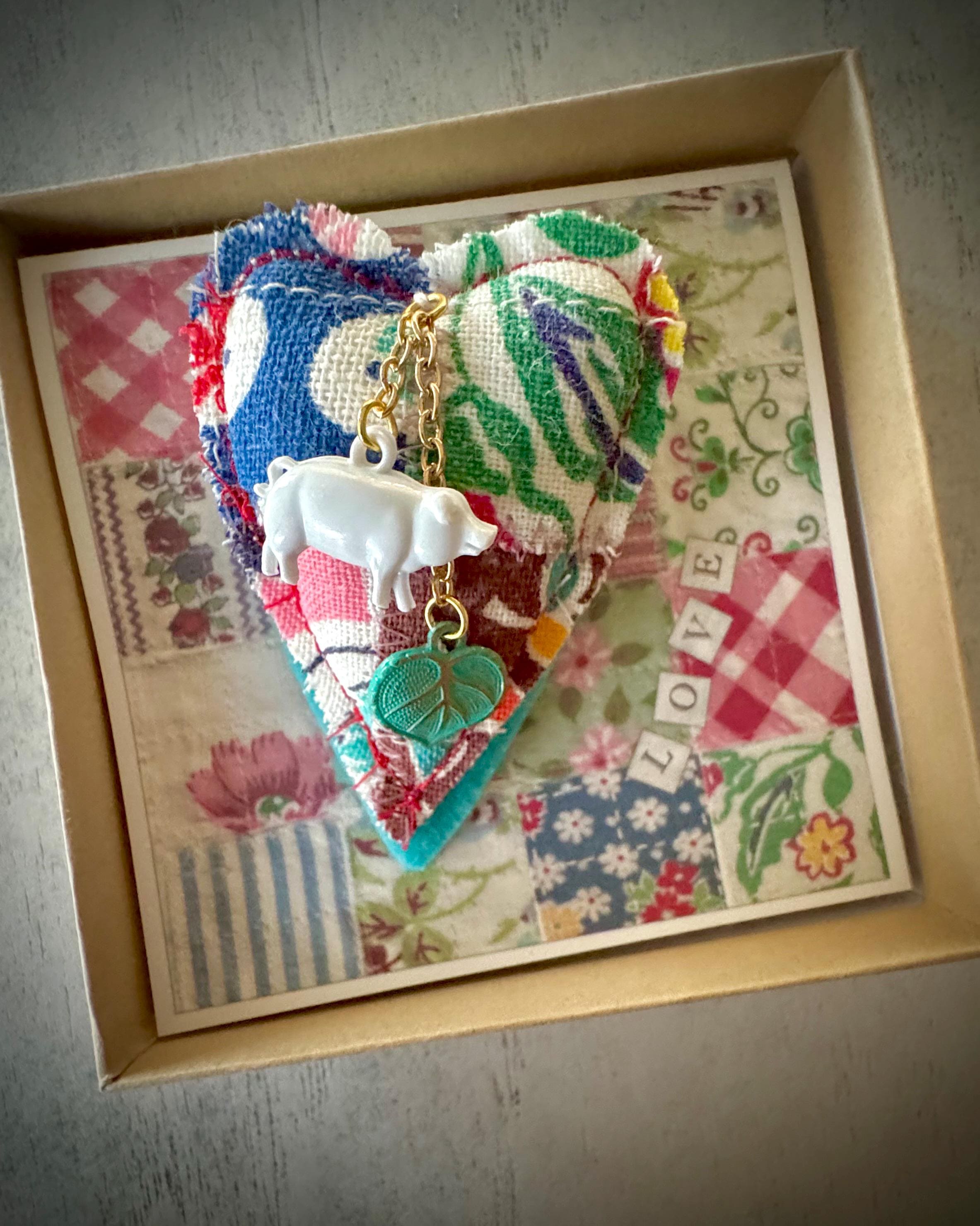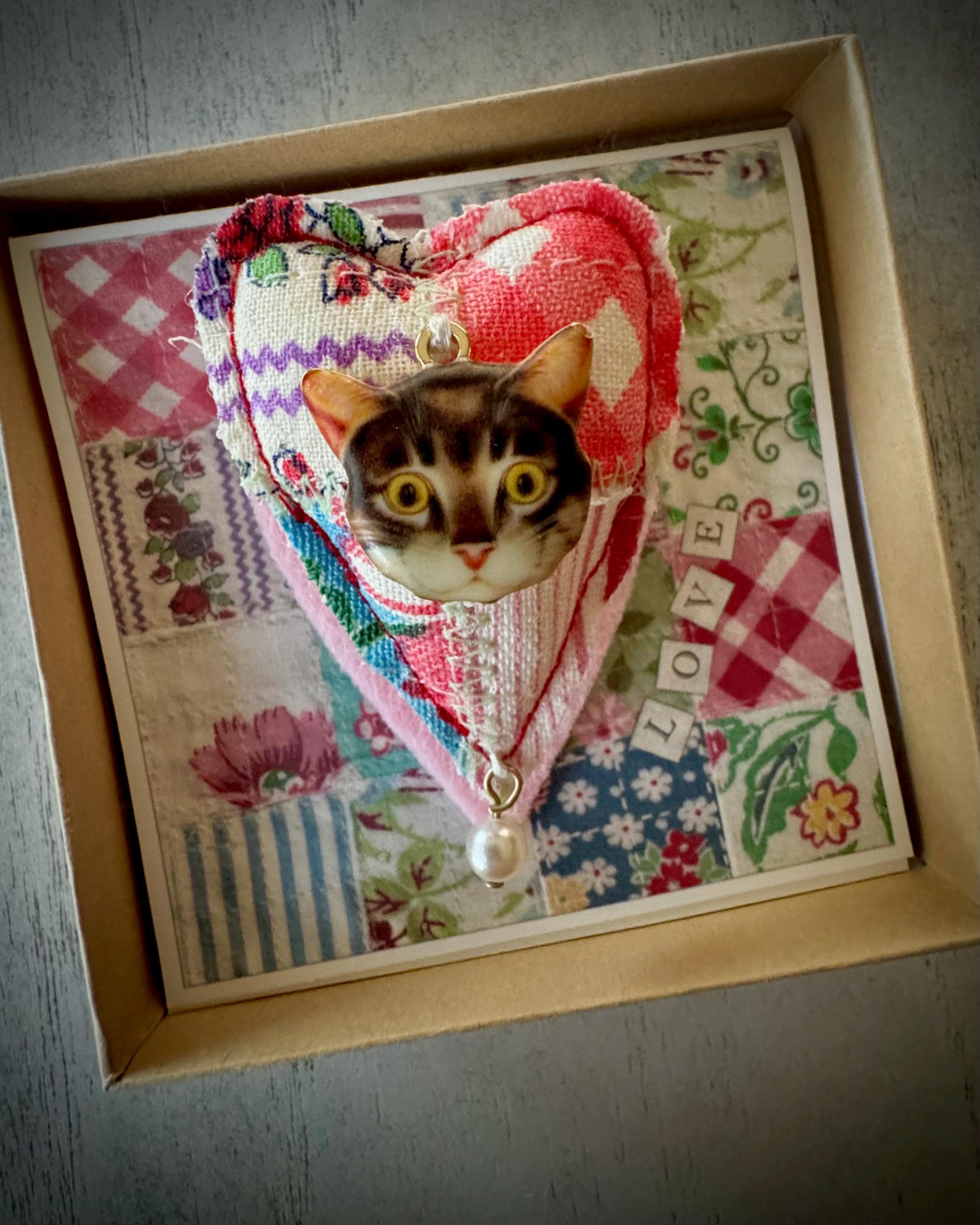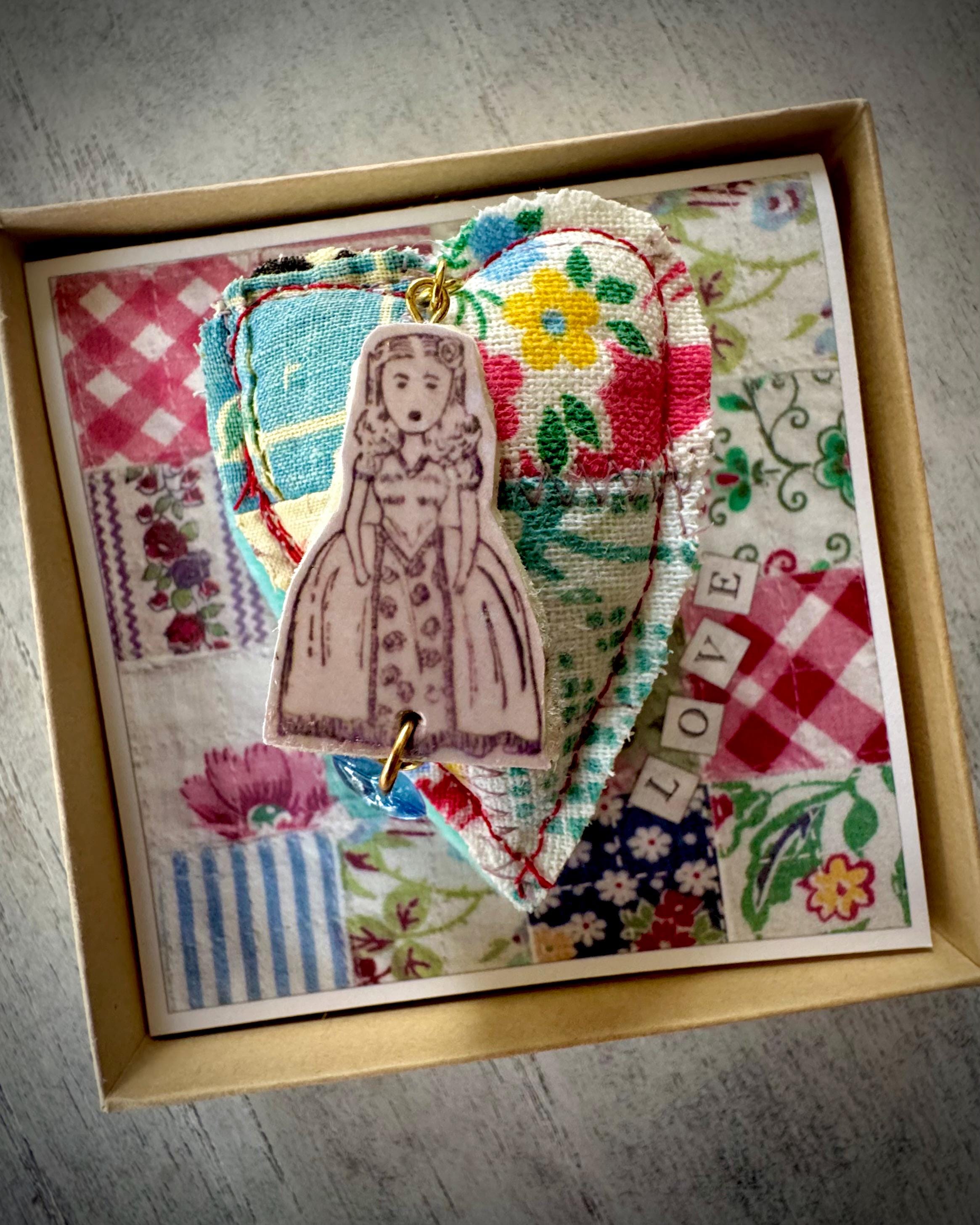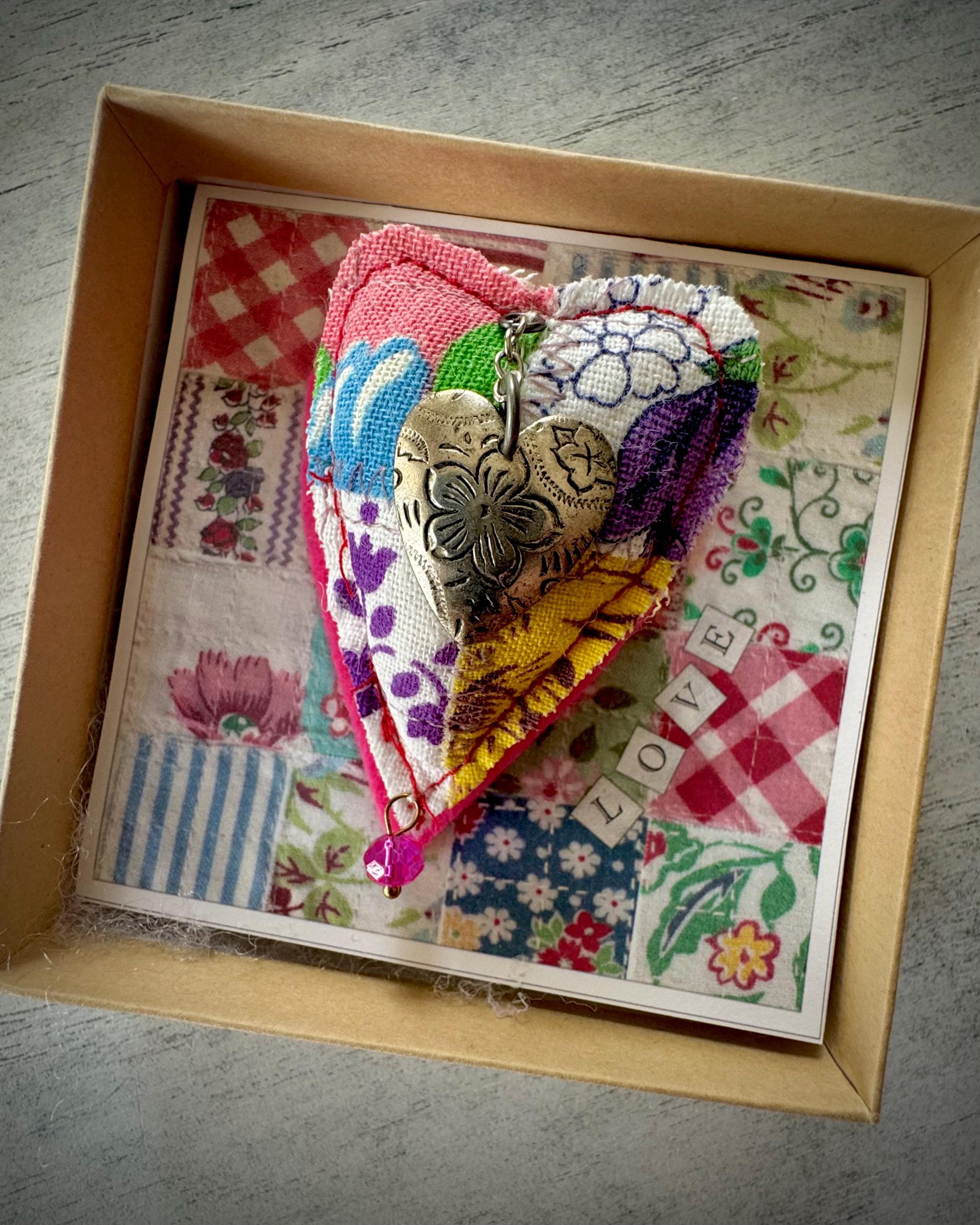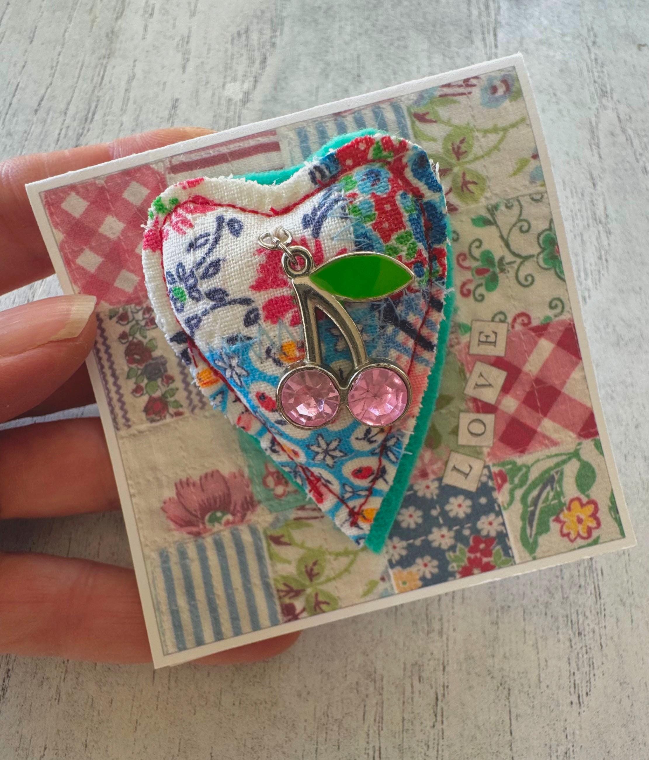 Embellished Upcycled Plush Heart Brooch with Greeting Card and Gift Box...All in one! Sweet fun gift for giving. Pick your greeting card sentiment. Heart brooch is attached to front of greeting card. Remove it to wear on a denim jacket or something fun.